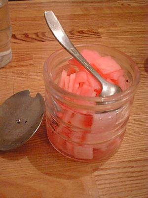 ダイコンの桜漬けは、ジャブジャブ漬かってるというわけでなく、味加減もよく、とても好きなのだが、最近はタマネギに凝っている。このタマネギをご飯にたくさんかけて、その上からカリーをかけて食べると、とてつもなく旨みが増す。一口毎に鳥肌もの(マジで)。(な)