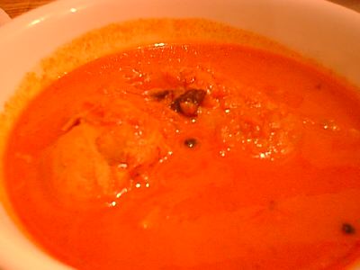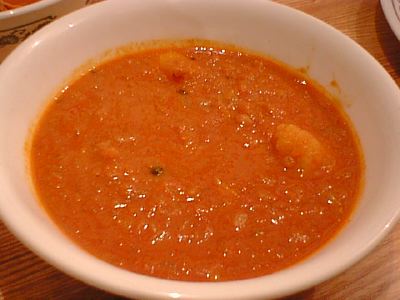 ここのマサラはタマネギがいっぱい入っていて、普通のカレーに比べてドロッとしてはいるけど、粘りがあるわけではなく、全体にマイルドな味わいになっています。そのためか、他のカレーと一緒に食べると薄味に感じるかな。エビマサラはちゃんとプリッとしたエビが3尾入っていて嬉しいです。(め)