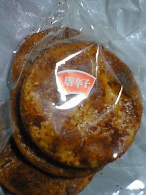 有さんおすすめの辛子煎餅を買ってみました。唐辛子がほどよくまぶっていて、ピリ辛醤油味の煎餅です。やたら唐辛子ベッタリの唐辛子煎餅とはちがって、品があります。そんなに辛いという感じじゃないんだけど、ぢんさんは辛いって言ってたから、人によって感じ方が違うかも。(め)