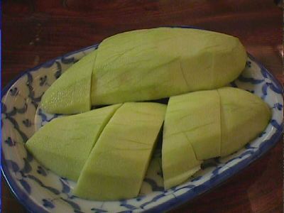 - 熟したマンゴーは甘く煮てココナッツミルクをかけたカオニャオ(もち米)と一緒に食べるデザートとして夜に出してくれるとのこと。味見用に1皿作ってくれました。熟したマンゴーは口の中で溶けるようにやわらかく、まるでシロップで煮たかのような甘味、濃縮されたマンゴーの香りが素晴らしくて、やみつきになりそうな味です。(め)