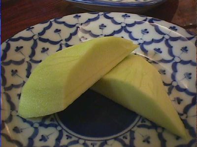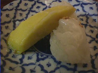 - もち米とマンゴーのデザート。これは本日のイチオシです。なんといってもバーニーさんがタイから持ち帰ってくれた甘く熟したマンゴーのおいしさ、これにつきます。僕は桃に似てる(黄桃から酸味をなくして甘くした感じ)と思うけど、いなはメロンみたいだって言ってました。まあ、とにかく究極の果物の美味しさと言っていいんじゃないでしょうか。うーん、これはまた食べたいです。(め)