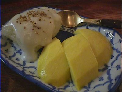 - こちらは熟したマンゴーがついてるが、とろけるような美味さ。食べ過ぎに注意ってところだろうか。これはタイでもかなり高価らしいが、マンゴーは果物の王様でもあるからうなずけるところ。カオニャオは、モチの香りと多めにかけられたココナッツミルクがとてもよかった。(な)