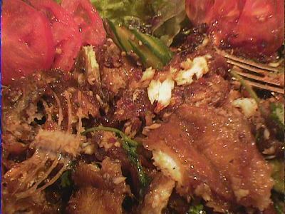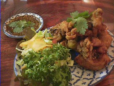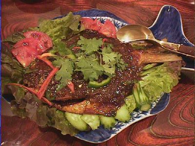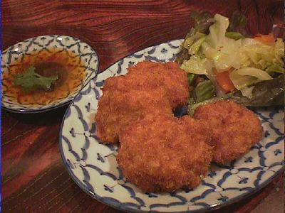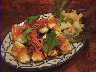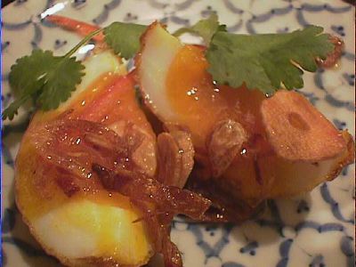 - ゆで玉子を揚げたものにタマリンドの入った甘いソースをかけた料理。タイでは有名な料理だけど、簡単でお金がとれないと思われるのか日本のタイ料理屋ではあまり見かけないメニューで、今まで銀座バイトンで一度食べたことがあるだけです。僕は結構好きだし、メニューに幅が出ると思うので、メニューに取り入れてもらうことにして、今回初めて作ってもらいました。無理にメニューに入れてもらってお客さんの評判が悪かったら困るけど(笑)。玉子が半熟具合でなかなかよいと僕は思うけれど、どうでしょうか。個人的には揚げニンニクはなくてもいいかな。(め)
