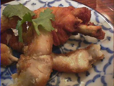 - 本来は燻して作るガイヤーン(焼き鳥)なのですが、前に作ったときに煙で店の中も外もいっぱいになってしまったので、ガイトード(揚げ鶏)として作っているとのこと。上手に香ばしく揚がっていて、これはこれで十分美味しいのですが、いつか燻して作ったガイヤーンも食べてみたいものです。(め)