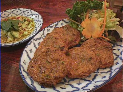 - 魚のすり身揚げ。これは昼に食べてみて、トートマンプラーとしては十分美味しいけど、トートマンクンのほうがみんなには受けそうだし、全体の品数が多いので、夜のコースからは削ってもらったつもりだったのですが、言葉がうまく通じなかったらしく、出てきてしまったものです。まあ、一人一個でたいした量ではないからいいかな。(め)