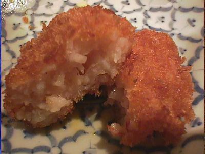 - エビのすり身揚げ。誰にでもすすめられる料理なので自信を持ってコースに入れたのですが、今日の出来は今までの中ではあまりよくないかな。いつもはこれよりもっと衣がサクサクで中がジューシーに仕上がってるように思うんだけど。でもまあ、決してまずくはなかったと思うんだけど。つけあわせの酢漬け野菜の漬かりが浅かったけど、これは上に書いたように急きょ作ってもらうことにしためです。(め)