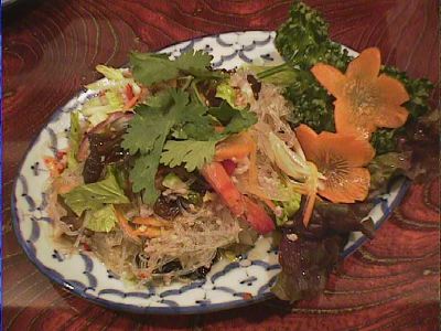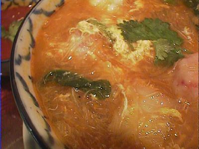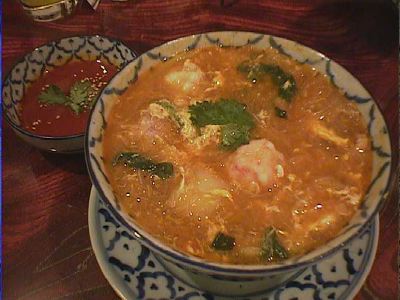 - いわゆるタイスキ。以前は自分で材料をスープに入れるスタイルのタイスキをやっていたのですが、材料が無駄になる上、あまりタイ料理屋で出す意味もないので、とりあえず今はやめています。こういうスープ形式でメニューに出したほうがいいのではないかと相談して、今回は実験的に作ってもらいました。春雨たっぷりでハクサイやすり身団子も美味しいのですが、味付けが普通のチリソースなので、なんだか韓国料理の辛いスープのようで、個人的にはちょっと不満かな。おなかがかなりいっぱいになってる状態で食べたせいもあるけど。これはおそらくまだ試行錯誤が必要ですね。(め)