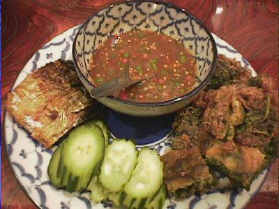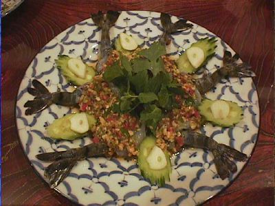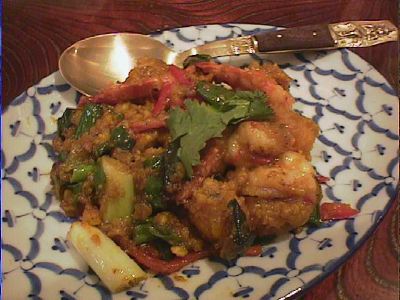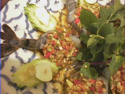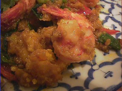 - 生エビのニンニク唐辛子ソース乗せ。今回、ヤム2種類とこの料理が辛さの点ではトップでしょう。特にグンチェアナムプラーは緑と赤のプリッキーヌが目にも鮮やかで、プリックの辛さと香りが最大に楽しめる一品です。この緑色のプリッキーヌが普通のプリッキーヌよりさらに小さい、一種青臭い独特の香りがするものです。今日は人数も多いので苦手な人もいるかと思って特にプリッキーヌを増量するようにお願いはしませんでしたが、みんな平気だったようなので、次の機会にはもっと増量してもらってもいいかもしれませんね:-)(め)