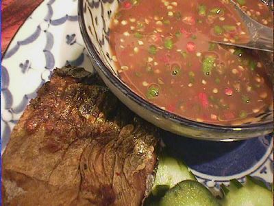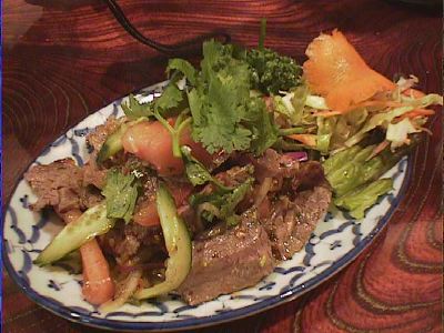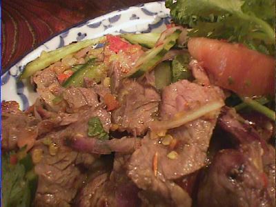 - 牛肉のサラダ。ヤムヌアはできるだけ牛肉がレア状態のほうが美味しいのですが、前に食べたとき、火の通った部分の香ばしさがよく出ていてよかったので、特に肉の焼き加減は注文をつけませんでした。でも、今度は外が香ばしく焼けていて中が生という状態を追求してもらおうかと思います。(め)