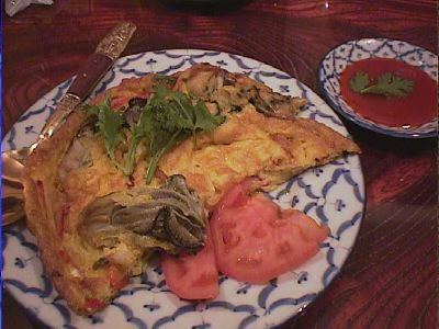 - カキ入り卵焼き。カキを使った料理を一品作ってもらおうと思って特別におねがいしました。タイ料理っぽさはないですが、タイの家庭では一般的な料理です。ちゃんと大きなカキを用意してくれて、玉子もふわっとやわらかく焼けていて、とてもよかったと思います。個人的にまた作ってもらおうかな。あ、メニューにあるカキ入りのお好み焼きもおすすめです。(め)