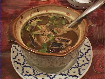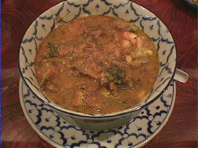 - イサーン料理の内臓のスープ。これはメニューにありますが、材料を用意しないといけないので、要予約です。内臓のことはよくわからないのですが(後でセアムさんに聞いたら、牛の内臓だそうです。)、赤っぽい腎臓のようなもの、表面が白くて切り身の見た目がちょっとグロいもの、肉っぽい繊維質のもの(ハツ?)と3種類が入っています。それぞれやわらかく煮えていて、なかなか美味しいものです。スープには五香紛が入ってているのかな?八角のような強い香りがついていました。(め)