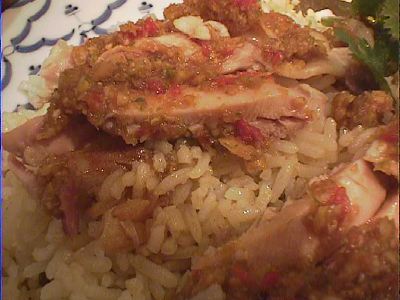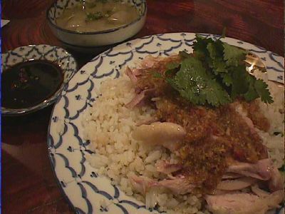 - ゆで鶏ごはん。メニューにはありませんが、ちゃんと鶏のスープでごはんを炊いたカオマンガイを作ってもらいました。よく味わうと鶏スープの味がしみたごはんがとてもおいしいし、鶏肉もやわらかくてよかったけれど、タレの味が強すぎるかな。もっとニンニクも押さえてさっぱりしたタレにしたもらうと、最高に美味しい料理になるような気がします。濃い味のものが続いたので、ついてきたダイコンのスープが嬉しかった。(め)