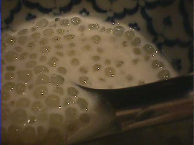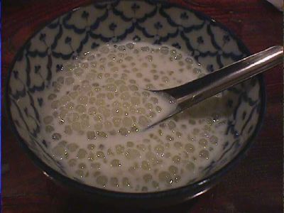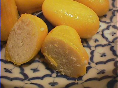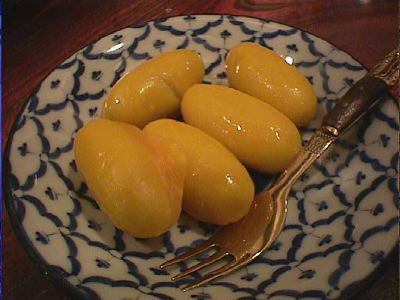 - 豆で作った甘い団子。料理の本によると「水でふやかした黄豆をミキサーにかけ、ココナッツミルクを加えて練りながら炊いて丸め、卵黄をまぶしてから熱いシロップにひたした」お菓子です。前に新宿シャムでよく食べて好きだったデザートで、なかなか食べられる店がないので、特別にリクエストして作ってもらいました。シャムで食べたものより固かったけれど、噛みしめると確かにあの味で、とても嬉しかった。また今度もうちょっとやわらかく作ってもらおうかな。(め)