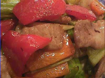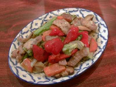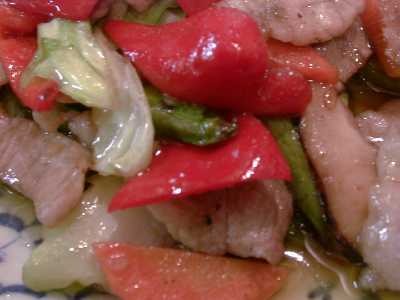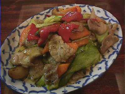 - 五目野菜炒め。豚肉がたっぷりと入っていて、野菜炒めというより豚肉野菜炒めですね。豚肉に適度に脂があって、野菜とよく合います。外から見えないけど中にアスパラガスがたくさん入ってます。バーニーさんが作ってくれたんだけど、見た目にも色合いの鮮やかさが食欲をそそるし、油を結構使ってるんだけど、食べてみるとちっともしつこくなくて、味つけも特定の調味料が突出してなくて、とてもいいです。塩気も適度なのでそのまま食べても美味しいし、ごはんにも合いそう。(め)