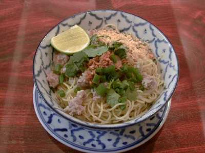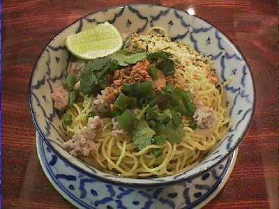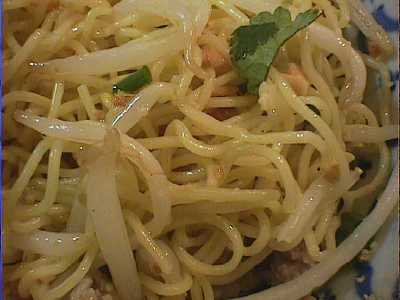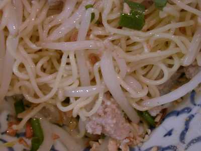 - タイ風汁なし麺(小麦粉麺)。今まであまり美味しいバーミーヘーンって食べた記憶がなかったのだけど、これはめちゃウマです。麺を油と調味料で和えた、要するに油そばのようなものなのだけど、このバーミーヘーンは調味油がよく麺にからんでいながら油の量が多すぎず適切だし、砕いたピーナッツや揚げニンニクが丁寧に作ってあって香りもよいし、挽き肉やモヤシの具も調和が取れていて、文句のつけようがないです。これからもしょっちゅう食べたくなりそうな一品です。(め)