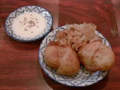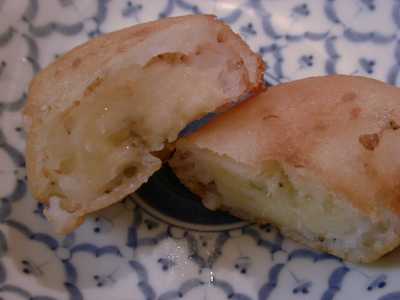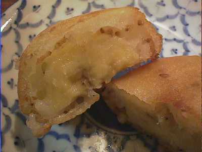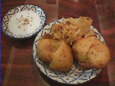- 揚げバナナ。メニューにはのせているけど、予約でもしておかないと普段はなかなか作れないことになっています。バナナなんて安いし、買っておいてもたいした負担にならないはずなのにと思って、理由を聞いてみたところ、これはラオターさんの得意料理でバーニーさんやセアムさんはまだ苦手なので、普段なかなか厨房にいられない(他の2人が日本語できないのでラオターさんが接客せざるを得ない)ラオターさんに余裕のあるときでないと作れないのだそうです。ってな話をした後にラオターさんがバナナを買ってきてくれて、さっそく作ってくれました。衣にココナッツミルクの香りがしてほんのり甘く、少しトロッとしたバナナによく馴染んでいます。ココナッツミルクに砂糖と塩の入ったタレをつけて食べますが、全体に甘さは押さえめで、前菜にもいけそうな感じのデザートです。これ、ココナッツアイスと一緒に食べても美味しいんじゃないかな。(め)