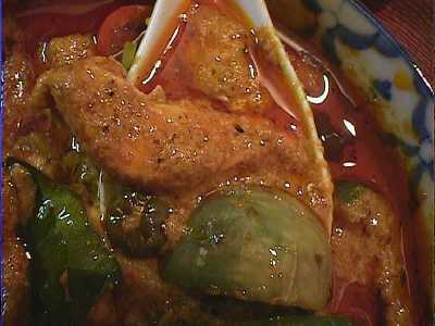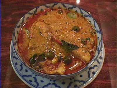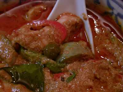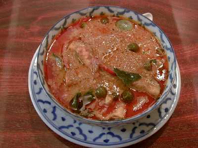 - 鶏肉のレッドカレー。実はまだゲーンペットを一度も食べていなくて、今日初めて食べました。ココナッツミルクの入ったとても辛いカレーにタイ産の大小のナス(小さいほうがマクアプアン、大きいほうがマクアパーオというのだそうです)と鶏肉などの具が入っています。この辛いカレーにタイのナスがとてもよく合っていて、完璧に近い美味しさでした。いろいろな店のいろいろな種類のタイカレーを美味しさという尺度で比べるのは適切でないかもしれないけど、あえて言わせてもらえば、今まで食べてきた中でも最高に美味しいタイカレーでした。夢中で食べてしまったけど、これはピッチーファーのカレーの中でもイチオシです。写真撮るの忘れたけど、最近はタイ米もちゃんとパラパラに炊いてくれるようになって、カレーの味を何倍にも引き立ててくれました。(め)