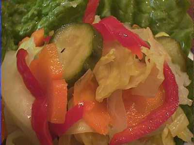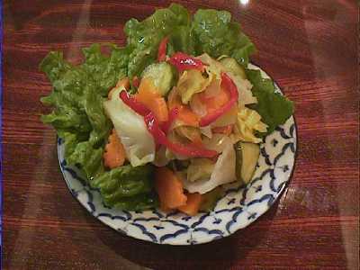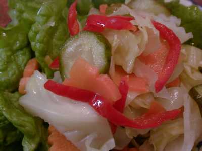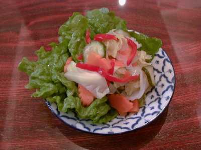 - 野菜の甘酢漬け。せっかくつけあわにしても残す人が多いらしく、甘酢漬け野菜が好きな僕としては納得がいかないのですが、好きな人もいるはずと信じて、単品メニューにしてもらいました。しつこい味のものを食べるときにはよい口直しになるし、僕はこれ大好きなんだけどなぁ〜。まあいいや。他のお客さんが食べなくても僕がせっせと食べるから(笑)(め)