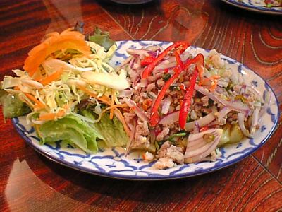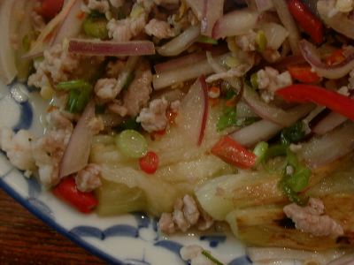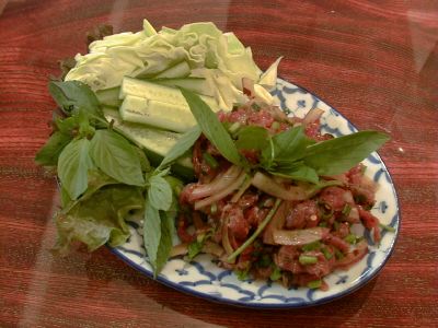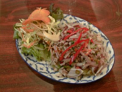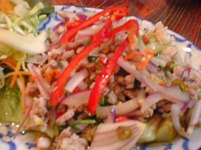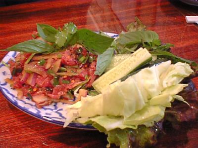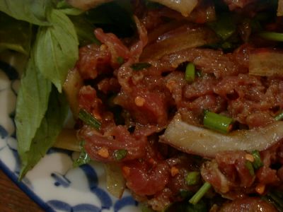 - これを食するのは2度目なんだけど、最初に食べたものと違う。Messiahの話では、これの上にパラパラかけられたものがあって、今回それはやめてくれと言ったのだが、かかってでてきていた。最初に食べたときは、肉のうまみがダイレクトに伝わってくくる、ユッケのような感じでとても素晴らしいと思ったのだが、今回それが入ってるおかげで魅力が減った。いろいろと味がからまっていて、その肉のうまみのダイレクトな感じが死んでいるように思う。Messiahがその旨ラオターさんと話ていて、実は最初に我々が食べたものは、ラオターさんが作ってくれたものと判明して、少々驚いた。(な)