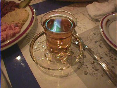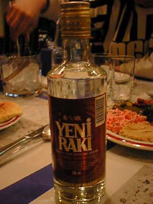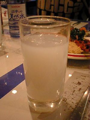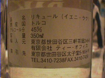 - ラクというトルコのリキュールです。これだけコップに注ぐと無色だけど、水をいれると白濁。不思議ですね。ラベルにはアニスシードと書かれていて飲むとなるほど、たしかにその味です。45度ぐらいあるのだけど、飲みやすく料理にとても合います。(な)