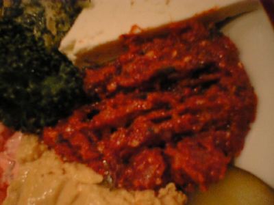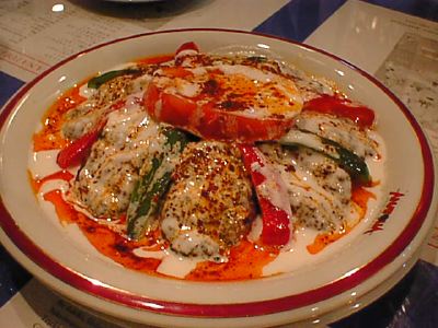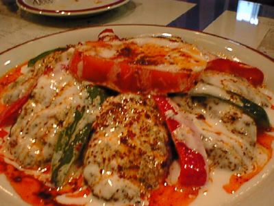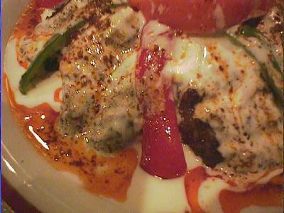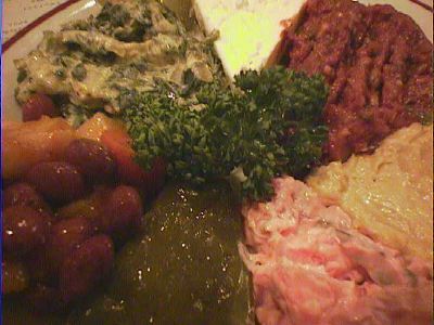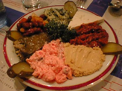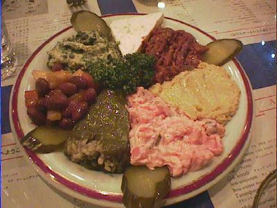- いろいろな前菜の盛り合わせで、トルコ料理ではこれを注文するのは定番ですね。ミント系のものやら、豆をつかったもの、トマトソース、チーズ等多種多様のものがあります。サワークリームみたいなやつがとても好みだったかな。(な)
