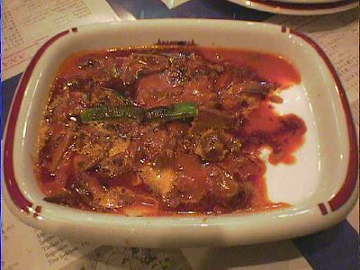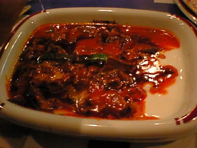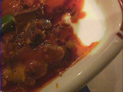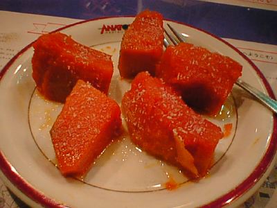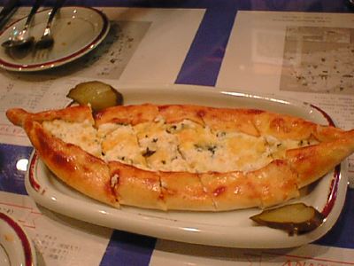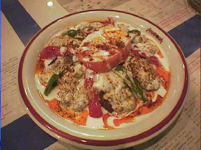 - 2×2.5cmほどにカットしたエキメキの上に、シシカバブを細かく削ぎ濃いソースで絡めたものをのっけてオーブンに入れたような・・・・トルコ版のグラタン(稲さんは日本の丼と表現してますが、そうなるとシンプルな牛丼ってとこですかね)。お肉のボソっとした感じと濃い味付けに、給食の鯨の立田揚げを思いだしました。(az)