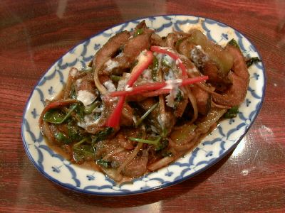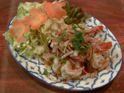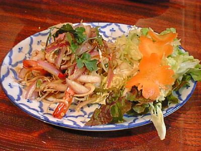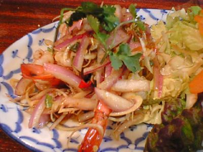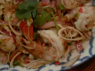 - 軽くボイルしたエビのレモングラス和え。要するにエビのヤムです。エビの火の通り加減がちょうどよくて、プリプリとして甘味のあるエビが味わえます。6尾入ってたので一人2尾食べられたし。プラニーさんがタレをとても辛くしてくれたので、一皿を3人で食べてもかなり辛さを堪能できました。(め)