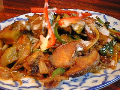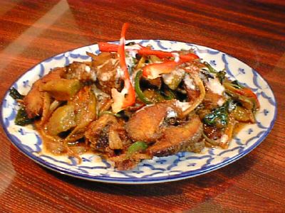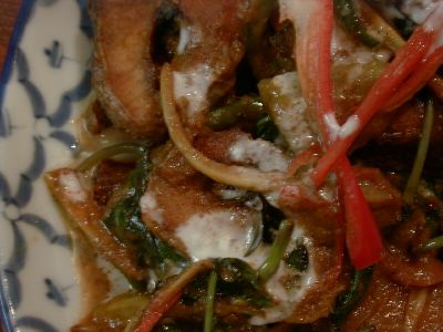 - ナマズの辛炒め。お客さんから「ナマズ料理を食べたい」というリクエストがあったということで、新メニューを試作してもらいました。これは実際はナマズ(プラードゥク)ではなくプラーションというナマズに似た魚なので正確には「パットペットプラーション」なんだけど、ナマズが手に入るときはナマズで作るとのことです。味付けは他の(エビやカエルの)辛炒めと同じく、ココナッツミルクを使い、クラチャイなどを使って香りをつけています。冷めないうちに食べたほうが美味しいですね。魚は輪切りにして揚げてあって、背骨だけちょっと固いけど簡単に取れるし、がんばれば背骨ごと食べられます。淡水魚だけど臭みは感じられず、普通の白身の魚のよう。次はナマズと食べ比べてみたいです。(め)