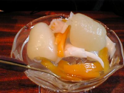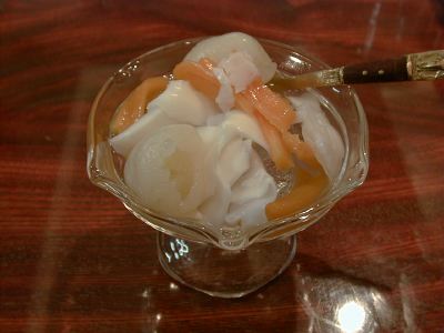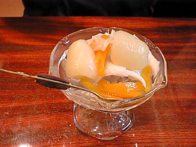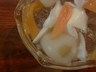 - ミックスフルーツのデザート。あとデザートで写真メニューができてないのがこれだけだったので、撮影したくて作ってもらいました。ラオターさんは、ルアムミットは材料の用意やクラッシュアイスを作るのが大変だったりするのでメニューから外すつもりでいたらしいけど、他のデザートが全てココナッツミルクを使った系統のものなので、一つくらい単純なシロップ味のさわやかなデザートがあったほうがいいと思うので、「氷も細かくしくていいし、材料もいつも用意してあるジャックフルーツと生のココナッツの実とランブータン(またはライチ)で十分だから」ということで、メニューに残してもらうことにしました。こういうシンプルなものをデザートに食べたいときもありますよね。(め)