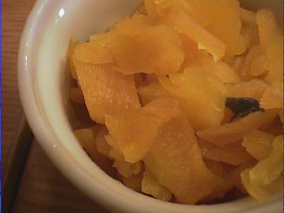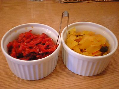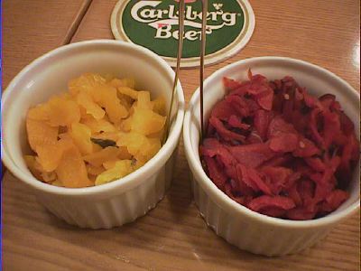 - 普通の福神漬けですね。赤と黄色の2色。黄色いほうはNekoyoに「カクテキ」と呼ばれていたものですね:-) 小野本には「ダイコンのハリハリ漬け」って書いてあるのでそれが正式名称なのかな。この手の薬味は単なる口休めにしかならないので、どうせならカレーの味を引き立てるタマネギのスライスを置いて欲しいな。(め)