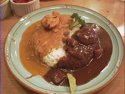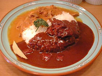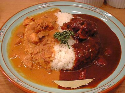 - これは二種類のカレーがセットになってる、アベックと呼ばれてるメニューだね。片方ずつ食べたり、混ぜて食べたり、楽しめてよさそうだね。(び)