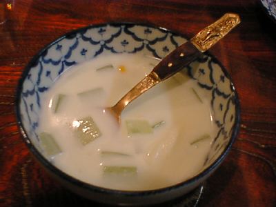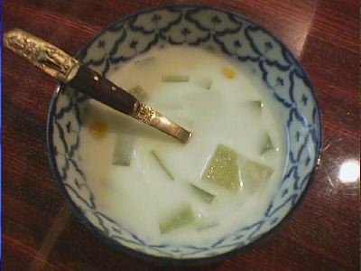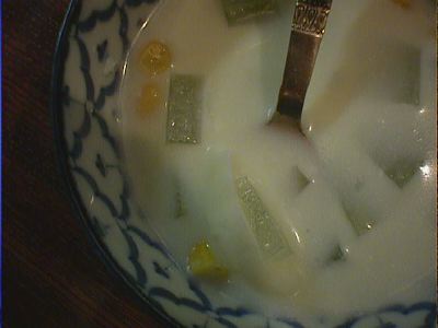 - 今日はなにかデザートは作ってないか聞いたところ、特別なものは作ってないけど、ランチに出したデザートなら残っているということで、寒天ゼリー入りココナッツミルクを出してもらいました。辛くなっていた口に心地よかったです。いつもココナッツミルクのデザートには色をつけて目も楽しませてくれるけれど、今日は緑色がつけてありました。(め)