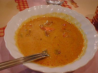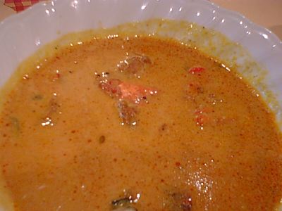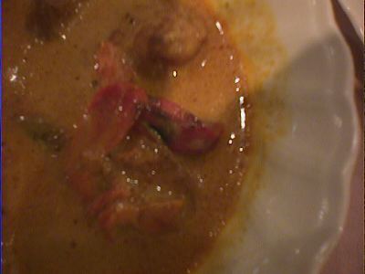 - これはいいです。大きめのプリッとした海老が5尾くらい入っていて、ソースにもエビの味がよく出ていて、カルダモンの香りが効いています。甘さも塩辛さもほどよくて、バランスのとれた美味しいカレーです。(め)