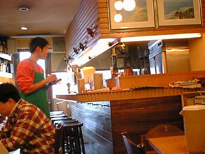 店内は喫茶店風の作りで、なぜか天井の梁の上にサーフボードが置いてあったりします。土曜日のせいか、昼の混雑時より遅い時間のせいか、店内は2〜3割ほどの入りで空いていました。