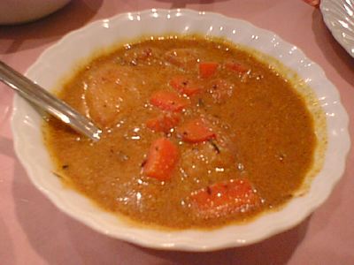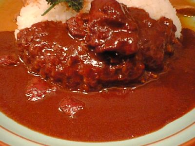 - 汁の少ないカレーに近い味付けだけど、最大の違いは冷たいこと。一瞬作り置きかと思うけど、皿ごと冷えていたし、わざと冷蔵庫に入れて冷やしたのでしょう。この冷たさがカレーと味を差別化してくれて、これはこれでよいかも。温かいままでも問題ない気もするけれど。(め)