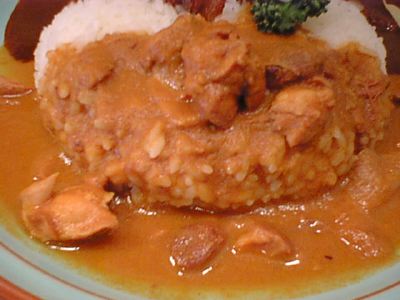 - 中央に丸く盛ったライスのまわりに2色のカレーがきれいにかかっています。黄色いほうがカシミール、茶色いほうがベンガルで、ベンガルのほうが辛口です。小野本には「ソース濃度はサラサラ」と書いてあったけど、実際は結構とろみがついていて、ごはんに染み込みません。そのおかげで2色のカレーが皿の上で混ざらずにすんでいます。カシミールのほうは食べた瞬間に「うわ、甘い」と感じる甘さがあるんだけど、後からじわっと辛さも追いかけてくる感じ。ベンガルのほうは辛口のカレーの中に少し甘味があるという感じ。それぞれに鶏肉が一片ずつはいってるけど、骨なし部分だし、ちょっと固いのが残念かな。普通に美味しいカレーという印象でした。(め)