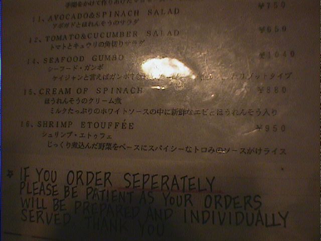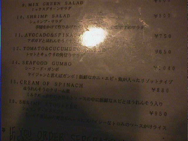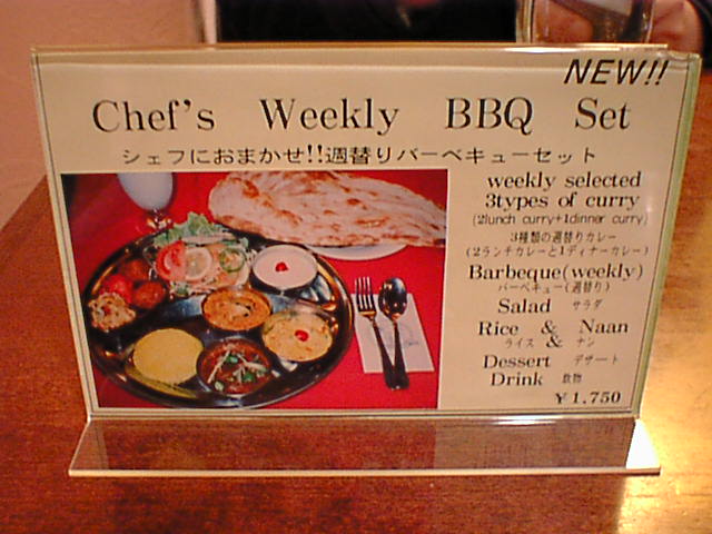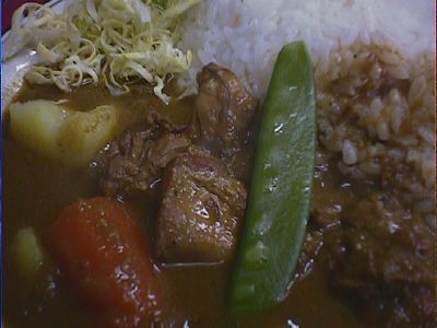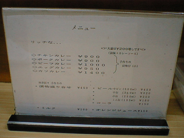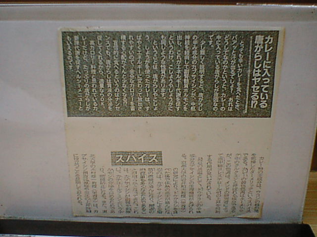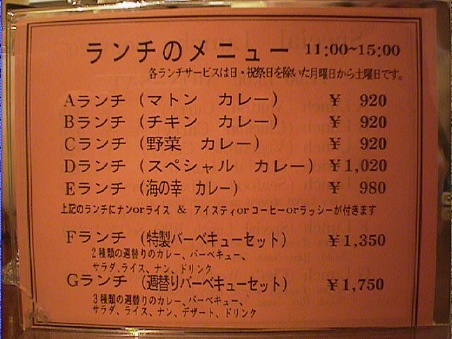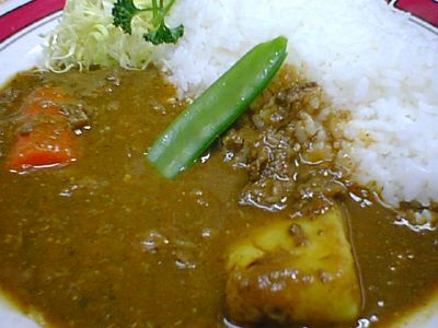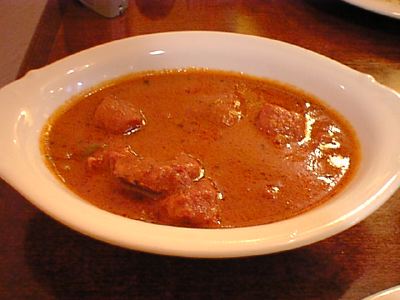 - マトンカリーにしたのはマトンのほうが臭みを消したりするため、スパイシーだと思ったので。実際チキンのほうがマイルドで、マトンはそれに比べ幾分スパイシーだった。味については標準より少々高めかな。スパイスもかどがたっていなく、日本人になじみやすいカリーに仕上っているとおもう。食べ慣れた人だとものたりないと思うが。(な)
