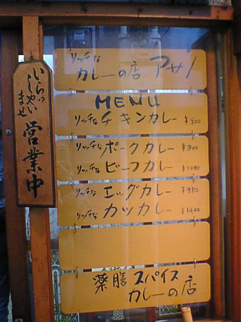 ということで予想通りアサノのカリーはとても素晴らしいものであった。また、ここのカリーは以前私が食べた三越前の印度風カリーライスにどことなく似ている。かといって三越前の印度風カリーライスにいけばいいかというと、まったくお門違いである。たがいにそれぞれ良いところがあるし、どちらか一方にいったからといって満たされるものではないのである。町田まで遠いので、それが悔やまれる。まじで通いたいカレー屋です。高校のときに来ていれば、松嶋菜々子と知り合えたかもしれないなぁ。あ、年が違うからそれは無理か(笑)(な)