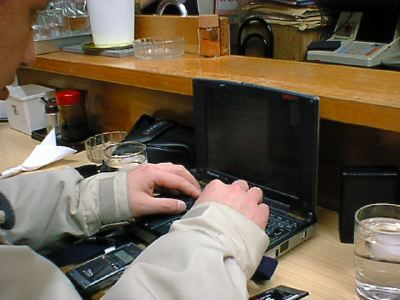 店内にはギャバンの缶がゴロゴロと並んでいる。なみなみならぬものをここで感じとった。写真に写ってるのは、息子さんかな。kazeさんはインターネットに接続しようとしてるが、電波がはいらなくて断念。