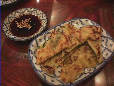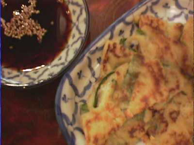 - 同じく、チヂミも出してくれました。ゴマ油の香りたっぷりの、ちゃんとしたチヂミです。なんで韓国料理の勉強してるの?って聞いたら、「もしタイに帰ったとき、タイ料理はいくらでもあるので、韓国料理のほうがいいと思って」と言ってたけど、さすがにそれは冗談でしょう。(め)