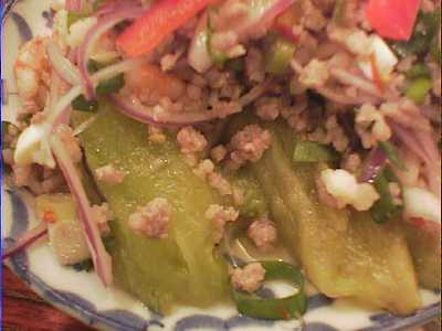 - 焼きナスのヤム。ヤムをどれか一つというときにはついこれを頼んでしまいます。ナスとエビと挽き肉にヤムの甘酸っぱいタレがしみて、とても美味しいです。(め)