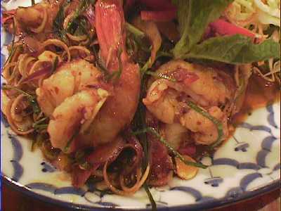 - エビものを一つ食べたいというリクエストがあったので、これを注文しました。軽くボイルしてプリッと食感のよいエビにタクライ(レモングラス)のスライスがたっぷりのサラダです。細く刻んだバイマックルーも効いてます。(め)