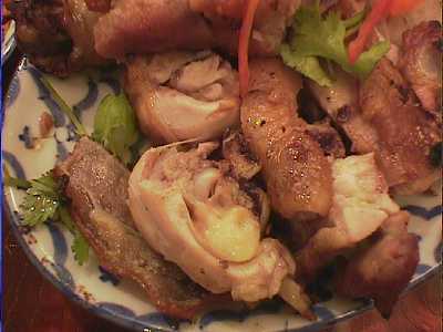 - 羊肉を塩ゆでしたもので、モンゴルではこれをどのくらい奇麗に食べられるかで男の価値が決まるというようなことがメニューに書いてありました。実際やってみると骨の回りについた肉を奇麗に落とすのはとても難しくて、なるほどと思います。脂のある部分、赤身の部分、血合いっぽい味のする部分と、場所によって味が違うのも面白いです。たくさん食べても胃もたれしそうにないけれど、ナイフで骨についた肉をこそげているうちにだんだん疲れてきてもういいやという気分になります:-)(め)