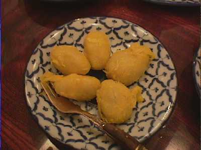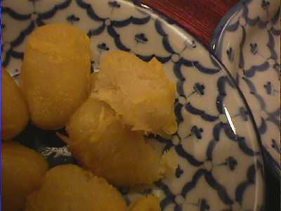 - 揚げバナナ。今日はバナナが黄色くてトロッとして甘くて美味しいなと思ったら、いつもと違うバナナを使ったとのこと。本当はこっちを使うものなんだそうです。(め)