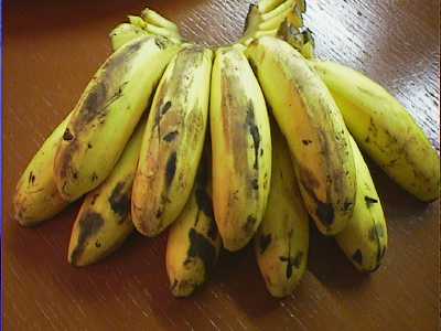 - これがそのバナナ。いわゆるモンキーバナナってやつですね。おすもうさんの指くらいの大きさの、小さくて甘いバナナです。(め)