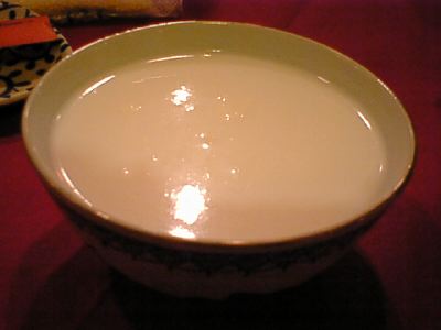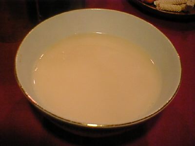 - 羊の乳(だよね)を発酵させて作ったお酒かな。マッコルリのような酸味と炭酸のあるお酒で、底のほうに白い固形物が沈殿しています。最初に一口飲んだときの後味に独特のクセを感じたけど、飲み慣れるとどうということはないです。小学校のときの給食のパンを牛乳にひたしたような香りがちょっとします。(め)