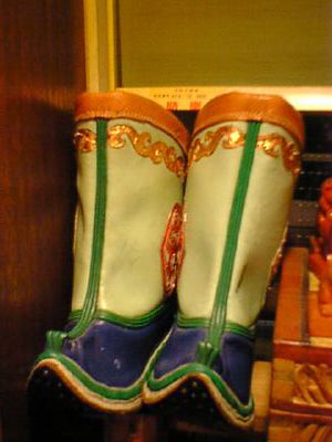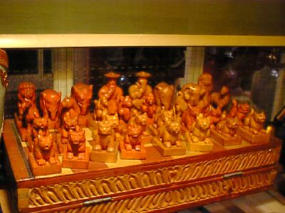 この写真はチェスの駒のようです。モンゴルについての本であるとか、衣装、羊肉の塊であるチャンサンマハを切って食べるためのナイフが壁につるされていたりします。