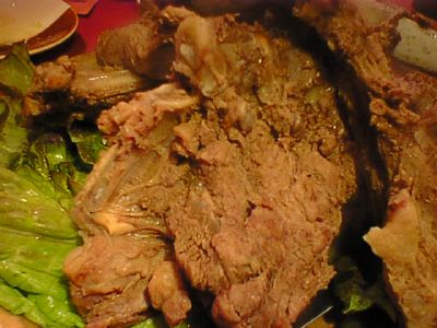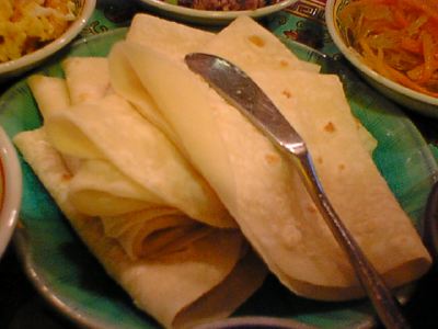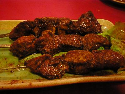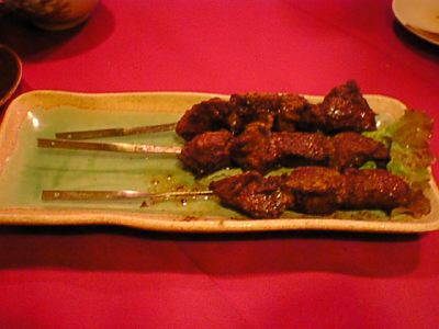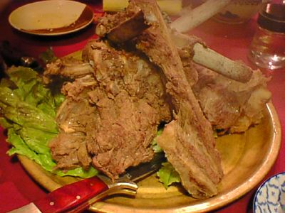 まさに肉肉肉、羊肉のきわめつけ。これをナイフでそぎ落として食べるという、豪快なものだけど綺麗にそぎ落とすのがとても難しい。臭みもなく、味もとても良い。基本的に脂身の部分というのがほとんどなくて、赤み中心である。なので胃にもたれるといったのがないです。また、噛めば噛むほど味がよくでていて、肉の味を味わうとはこのことかと納得できる。羊肉はコッテリという感じはなくて、やさしい味とでもいうのかとにかくこれはお勧め。(な)