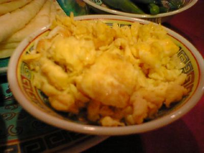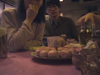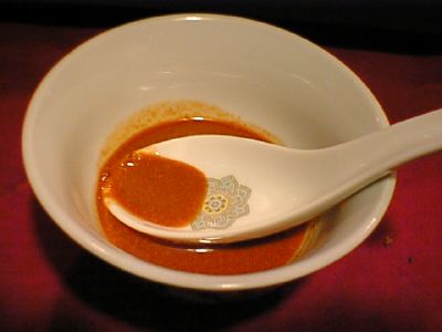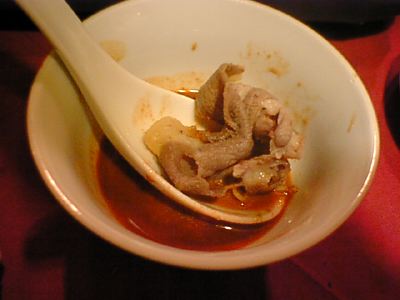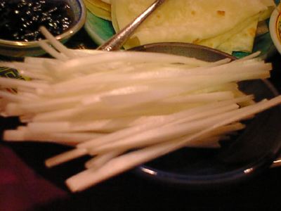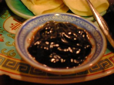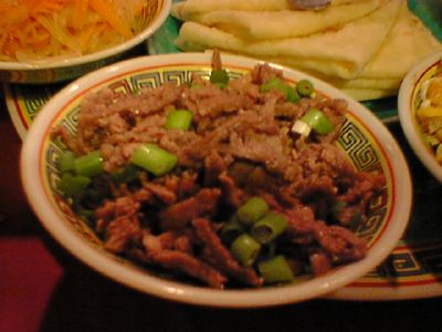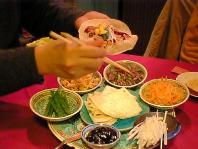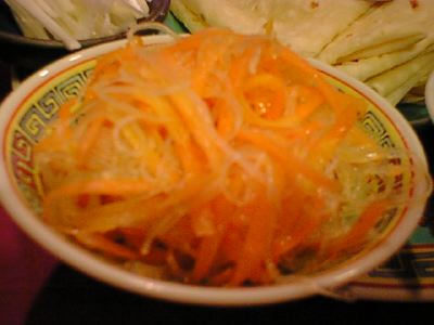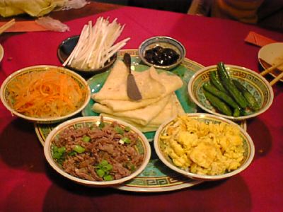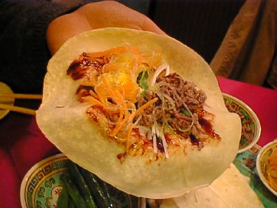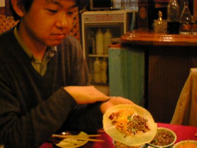 - ずいぶんいろんな具があるんだけど、全部入れて食べてみると、妙に味が調和して、具の味がばらばらにはなりません。テンメンジャン(バターナイフがついてるのは面白い。確かにバターナイフはぬりやすくていいです)をよく全体にのばすといいです。肉は家庭で作るチンジャオルースーの肉のような感じで、塩気が強いけれど、他の具とあわさったときに丁度良い味付けになっています。(め)