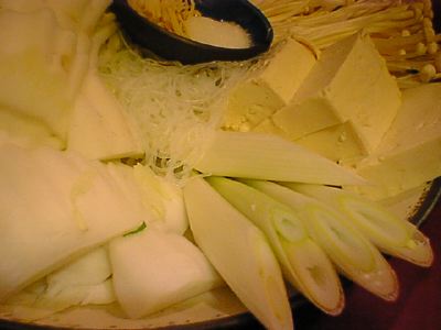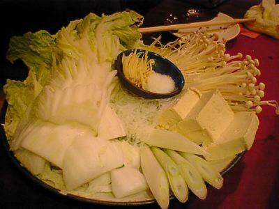 - 湯が沸いたら適当に野菜を入れて、あとは箸で肉をつまんで湯で躍らせる。